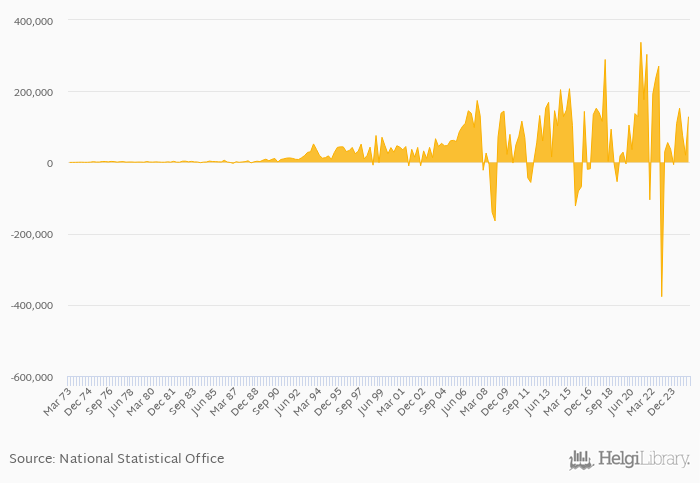 Historically, portfolio investments in the USA reached an all time high of USD 337,342 mil in 1Q2021 and an all time low of USD -377,214 mil in 4Q2022.