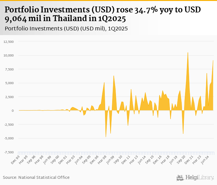 Portfolio investments rose 34.7% yoy to USD 9,064 mil in Thailand in 1Q2025, according to the National Statistical Office. This is 76.7% more than in the previous quarter.
