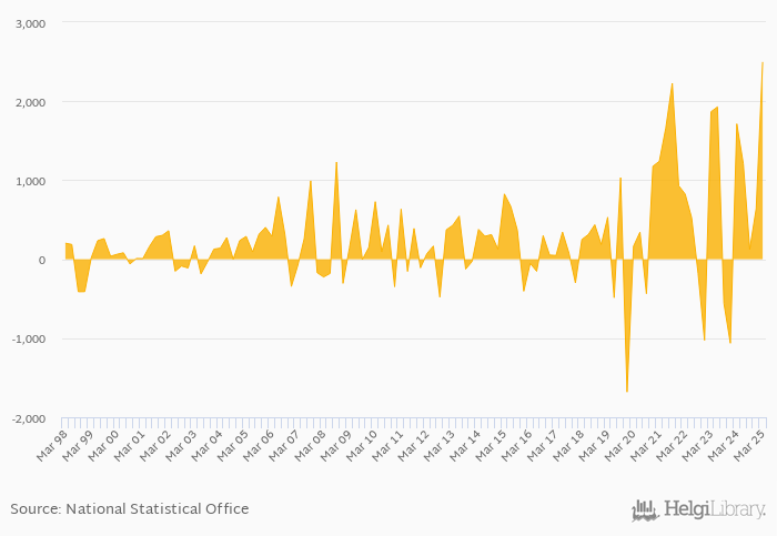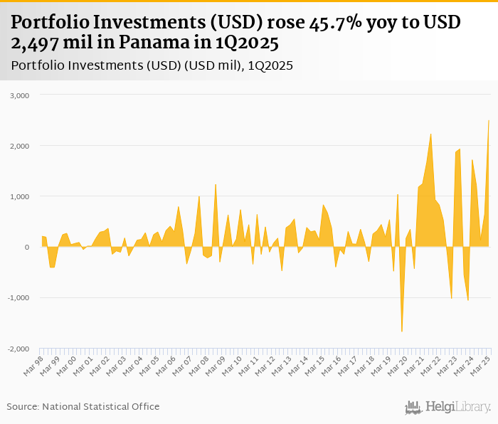 Portfolio investments rose 45.7% yoy to USD 2,497 mil in Panama in 1Q2025, according to the National Statistical Office. This is 290% more than in the previous quarter.