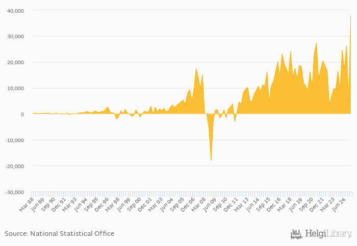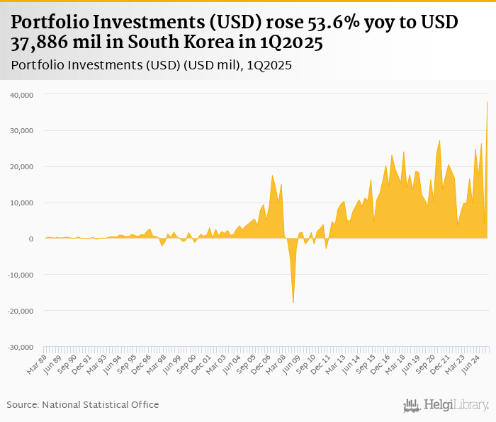 Portfolio investments rose 53.6% yoy to USD 37,886 mil in South Korea in 1Q2025, according to the National Statistical Office. This is 805% more than in the previous quarter.