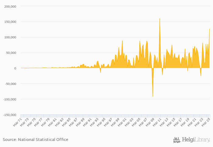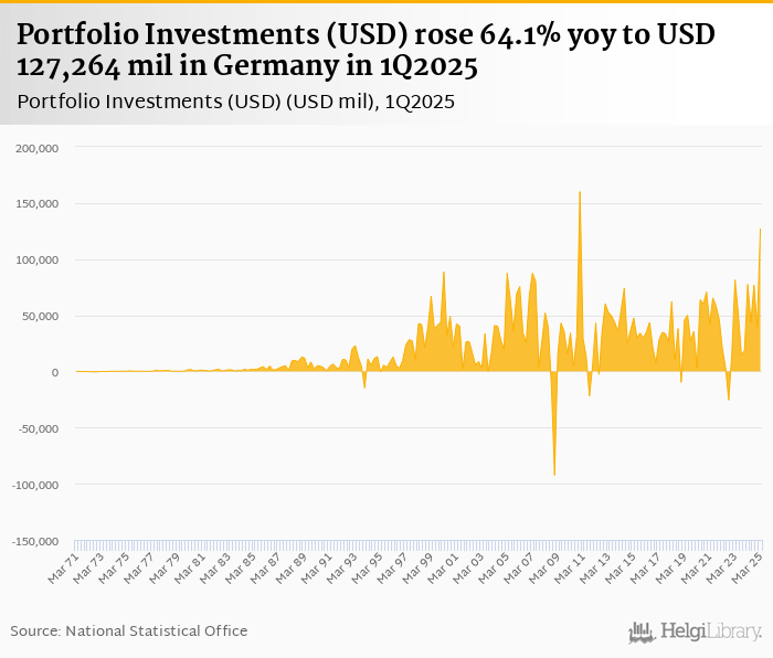 Portfolio investments rose 64.1% yoy to USD 127,264 mil in Germany in 1Q2025, according to the National Statistical Office. This is 217% more than in the previous quarter.
