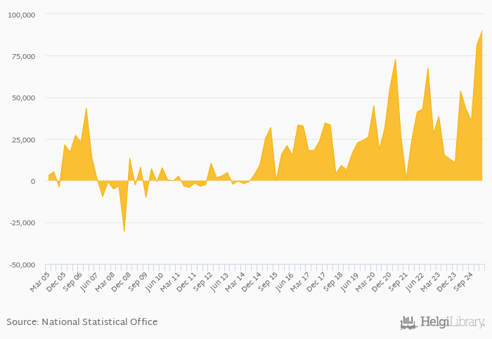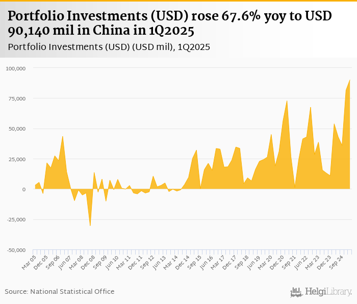 Portfolio investments rose 67.6% yoy to USD 90,140 mil in China in 1Q2025, according to the National Statistical Office. This is 10.6% more than in the previous quarter.