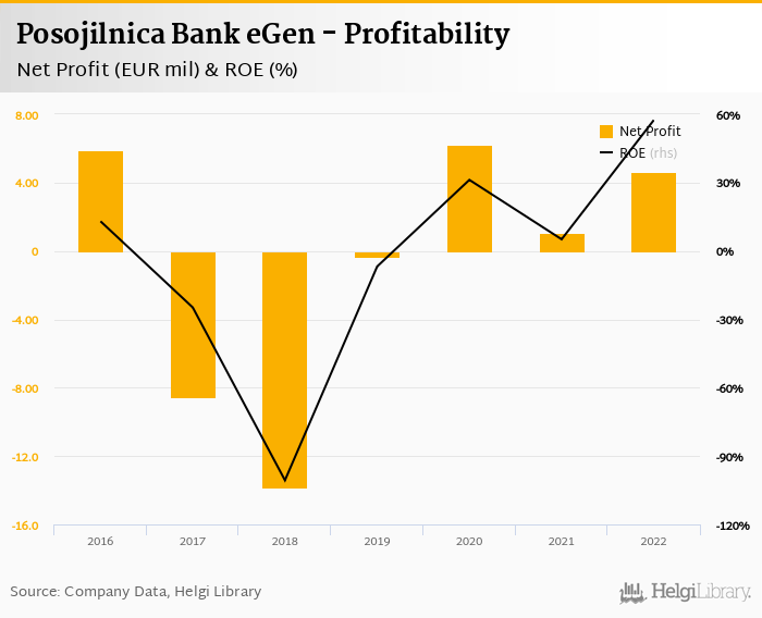 Posojilnica Bank eGen made a net profit of EUR 4.63 mil in 2022, up 343% compared to the previous year. This implies a return on equity of 57.4%.