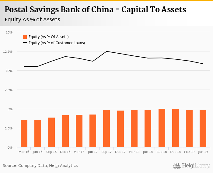 Postal Savings Bank of China's Equity reached 4.91% of total assets in the 2Q2019, up from 4.86% for the previous year. As a share of net customer loans, the ratio amounted to 10.9% at the end of the second quarter of 2019.