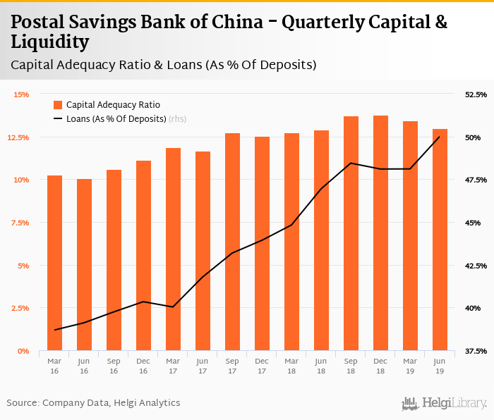 Postal Savings Bank of China's capital adequacy ratio reached 13.0% at the end of second quarter of 2019, down from 13.4% when compared to the previous quarter. Historically, the bank’s capital ratio hit an all time high of 13.8% in 4Q2018 and an all time low of 10.0% in 2Q2016.