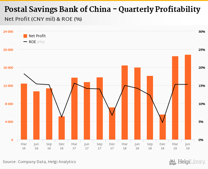 Postal Savings Bank of China made a net profit of CNY 18,861 mil in the second quarter of 2019, up 17.7% when compared to the same period of last year. This implies a return on equity of 15.3%.