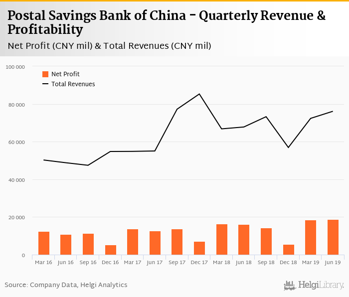 Postal Savings Bank of China made a net profit of CNY 18,861 mil under revenues of CNY 76,108 mil in the second quarter of 2019, up 17.7% and 12.3% respectively when compared to the same period last year.