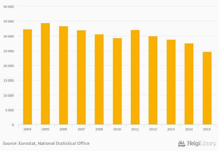 Historically, total workforce of postal service in Belgium reached an all time high of 34,360 persons in 2005 and an all time low of 24,703 persons in 2015.