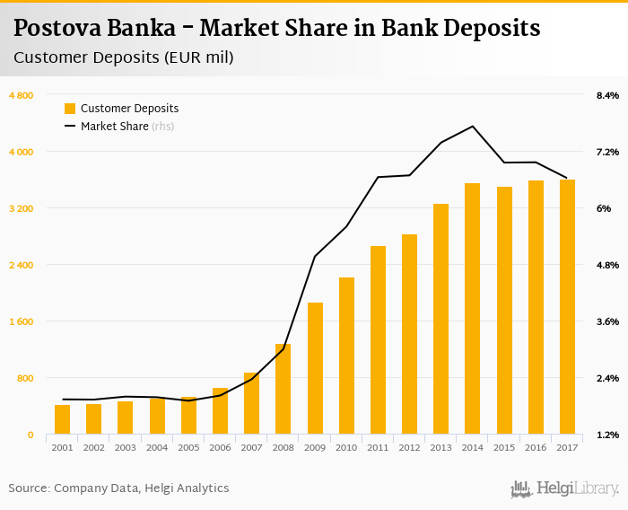 Postova Banka accounted for 6.62% of all customer deposits taken by banks in Slovakia at the end of 2017. Historically, the bank’s market share in customer deposits reached an all time high of 7.72% in 2014 and an all time low of 1.90% in 2005.