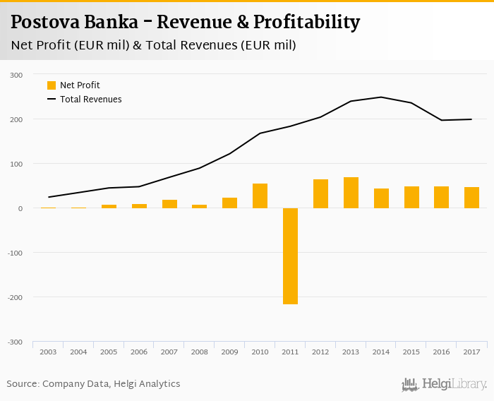 Postova Banka made a net profit of EUR 47.9 mil under revenues of EUR 198 mil in 2017, up -2.78% and 1.06% respectively compared to the previous year.