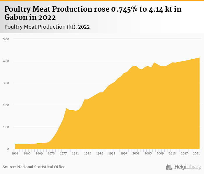 Poultry meat production rose 0.745% to 4.14 kt in Gabon in 2022, according to Faostat.