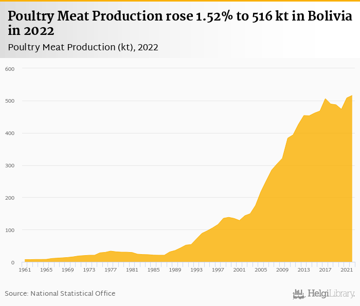 Poultry meat production rose 1.52% to 516 kt in Bolivia in 2022, according to Faostat.