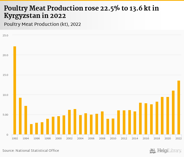 Poultry meat production rose 22.5% to 13.6 kt in Kyrgyzstan in 2022, according to Faostat.