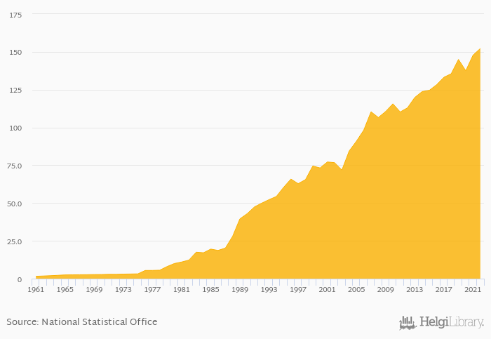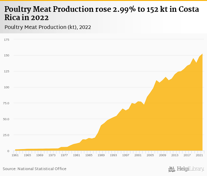 Poultry meat production rose 2.99% to 152 kt in Costa Rica in 2022, according to Faostat.