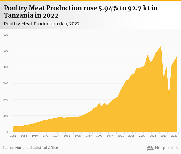 Poultry meat production rose 5.94% to 92.7 kt in Tanzania in 2022, according to Faostat.