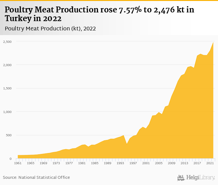 Poultry meat production rose 7.57% to 2,476 kt in Turkey in 2022, according to Faostat.