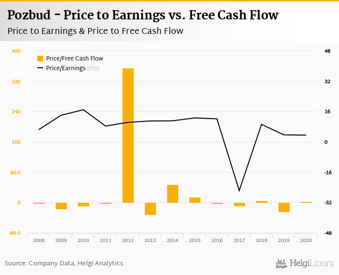 Regarding cash generated defined by the sum of net profit and depreciation, the stock traded at 2.75x at the end of 2020. When investments are excluded to get free cash flow, Pozbud traded at 3.45x.