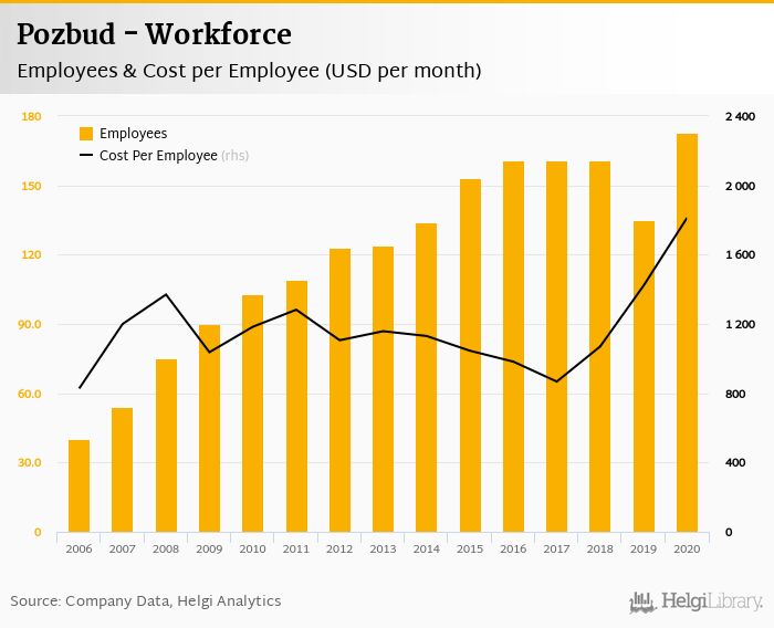 Pozbud employed 173 employees in 2020, up 28.1% compared to the previous year. Historically, between 2006 and 2020, the firm's workforce hit a high of 173 employees in 2020 and a low of 40.0 employees in 2006.