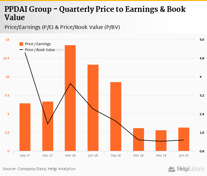 At the end of 2Q2019, the bank traded at price to earnings of 3.19x. Within the last five years, the multiple reached an all time high of 14.3x in 1Q2018 and an all time low of 2.81x in 1Q2019 with an average of 7.17x.