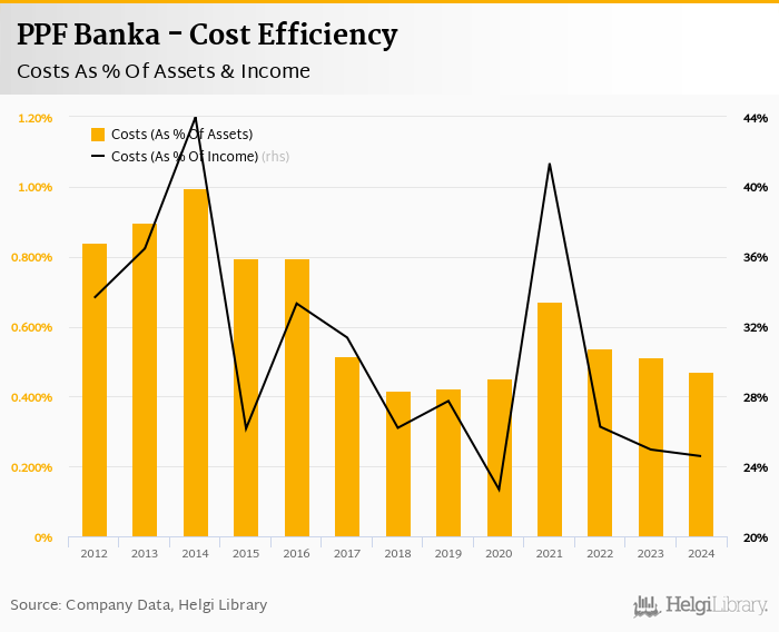 PPF Banka's cost to income ratio reached 24.6% in 2024, down from 25.0% compared to the previous year.