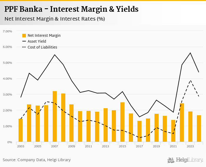 Comparing PPF Banka with its closest peers, Ceska Sporitelna operated in 2024 with a net interest margin of 2.08% in 2024, CSOB reached 1.66% and Komercni Banka some 1.66%.