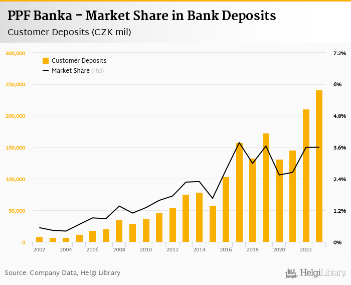 PPF Banka accounted for 3.60% of all customer deposits taken by banks in Czechia at the end of 2023. Historically, the bank’s market share in customer deposits reached an all time high of 3.77% in 2017 and an all time low of 0.409% in 2004.