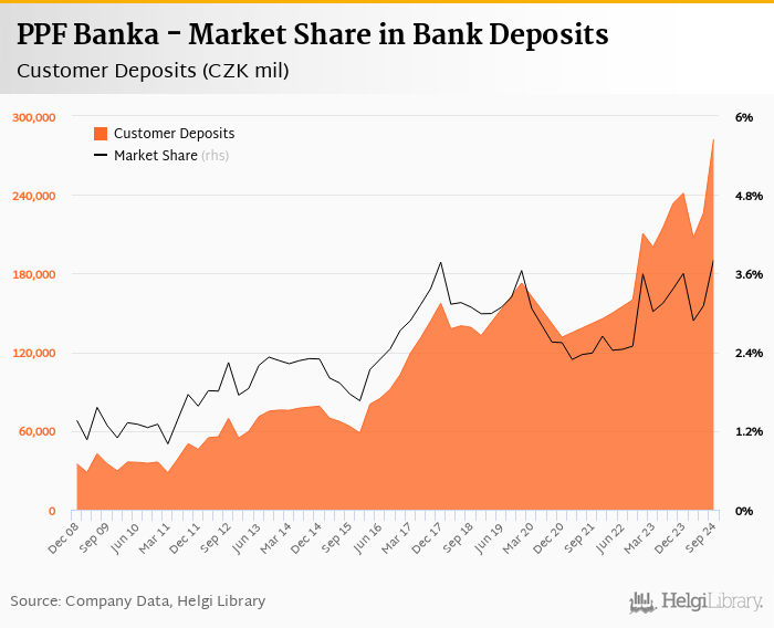 PPF Banka's customer deposits reached CZK 282,233 mil in 2024-09-30, up 24.7% compared to the previous year.