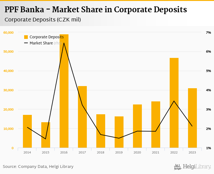 PPF Banka accounted for 2.11% of all corporate deposits taken by banks in Czechia at the end of 2023. Historically, the bank’s market share in corporate deposits reached an all time high of 6.45% in 2016 and an all time low of 1.45% in 2015.