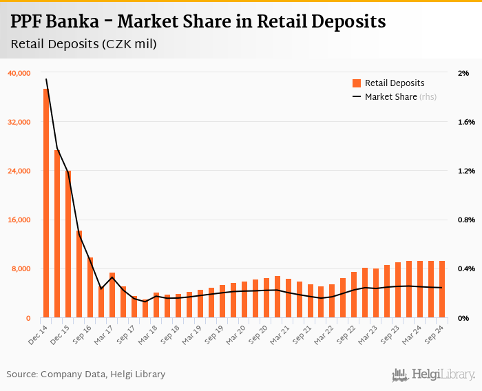 PPF Banka accounted for 0.243% of all retail deposits taken by banks in Czechia at the end of 2024-09-30. Historically, the bank’s market share in retail deposits reached an all time high of 1.95% in 2014-12-31 and an all time low of 0.127% in 2017-12-31.