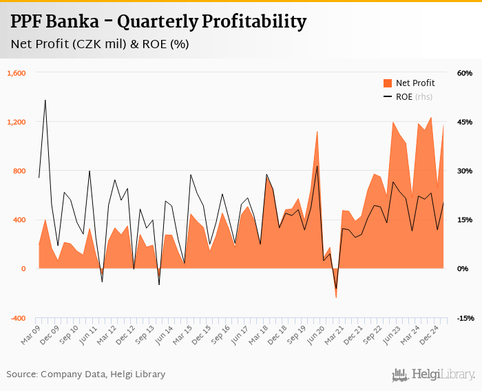 PPF Banka made a net profit of CZK 1,171 mil in the first quarter of 2025, down 0.898% when compared to the same period of last year. This implies a return on equity of 20.3%.