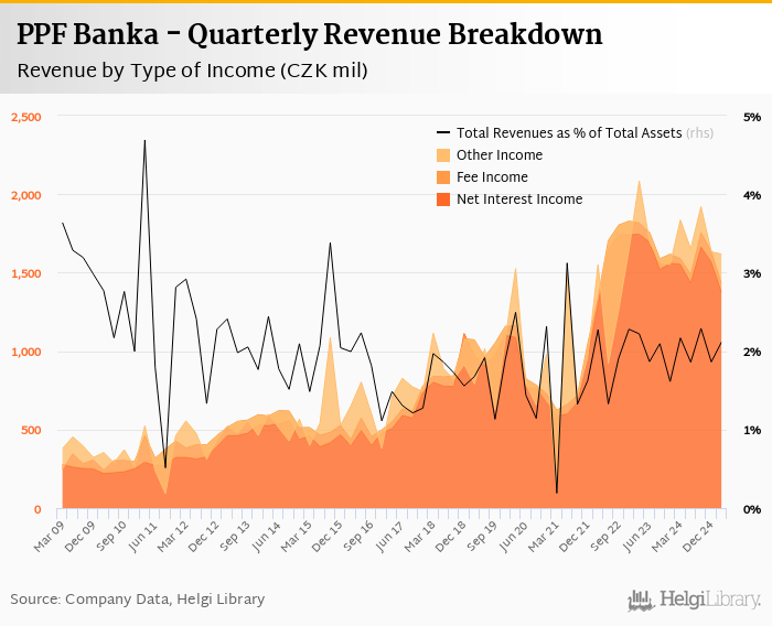 PPF Banka generated total banking revenues of CZK 1,618 mil in the first quarter of 2025, down 11.8% when compared to the same period of last year and 0.905% when compared to the previous quarter.