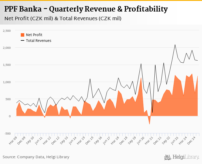 When compared to bank's main peers, Ceska Sporitelna generated a quarterly net profit of CZK 5,748 mil with revenues of CZK 14,186 mil in 1Q2025, CSOB netted CZK 4,403 mil (revenues of CZK 11,676 mil) and Komercni Banka announced a net profit of CZK 4,236 mil (revenues of CZK 9,135 mil).