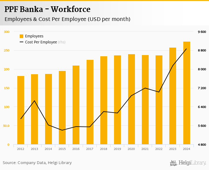 PPF Banka employed 274 persons in 2024, up 6.20% when compared to the previous year. Historically, the bank's workforce hit an all time high of 274 persons in 2024 and an all time low of 182 in 2012.