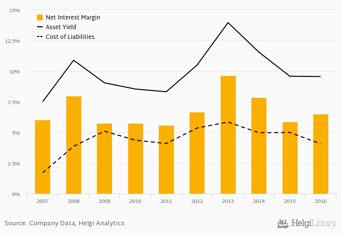 Historically, the bank’s net interest margin reached an all time high of 9.66% in 2013 and an all time low of 5.59% in 2011. The average margin in the last five years amounted to 7.32%.