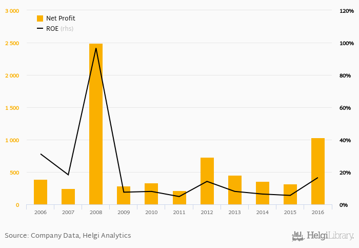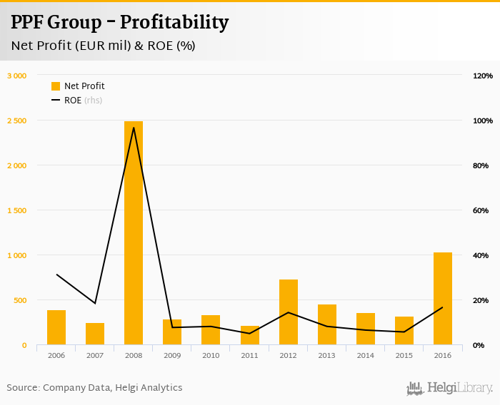 PPF Group made a net profit of EUR 1,031 mil in 2016, up 227% compared to the previous year. This implies a return on equity of 16.6%.