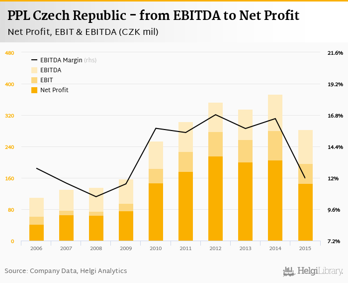 PPL Czech Republic made a net profit of CZK 146 mil with revenues of CZK 2,366 mil in 2015, down by 29.3% and up by 4.91%, respectively, compared to the previous year. This translates into a net margin of 6.17%.