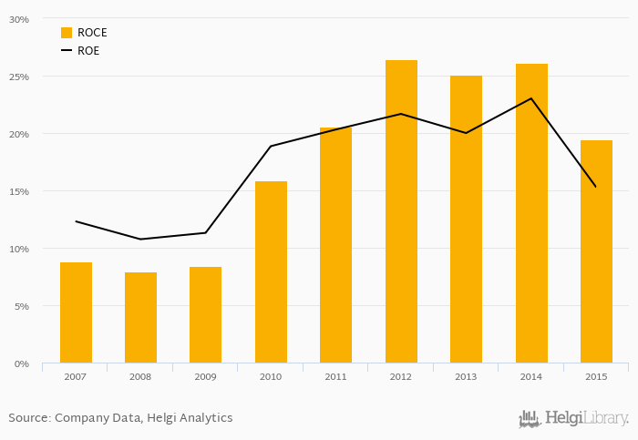 The result implies a return on equity of 15.3% and a return on invested capital of 19.4% in 2015. That is compared to an average of 20.0% and 23.5% over the last five years.