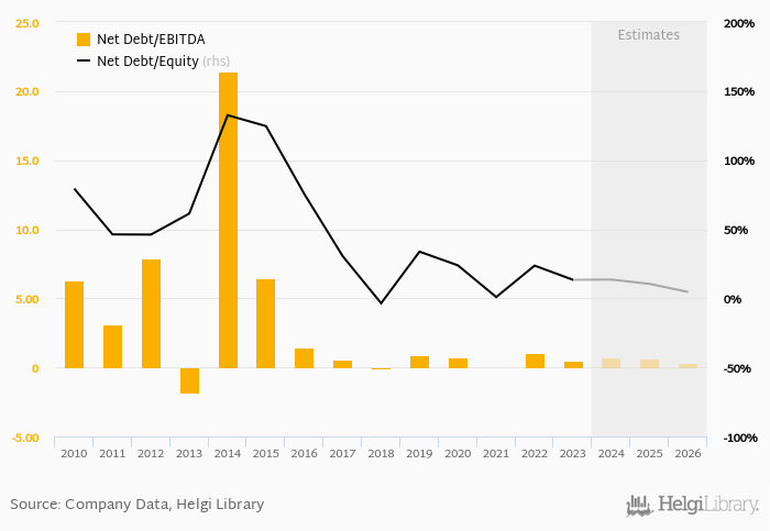 Historically, the firm’s net debt to equity reached a high of 133% in 2014 and a low of -3.57% in 2018 between 2010 and 2023. The average for the last five years was 19.1%.