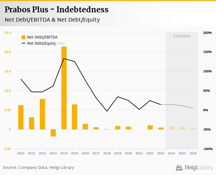 Prabos Plus's net debt stood at CZK 30.6 mil and accounted for 13.4% of equity at the end of 2023. The ratio is down 10.3 pp compared to the previous year.