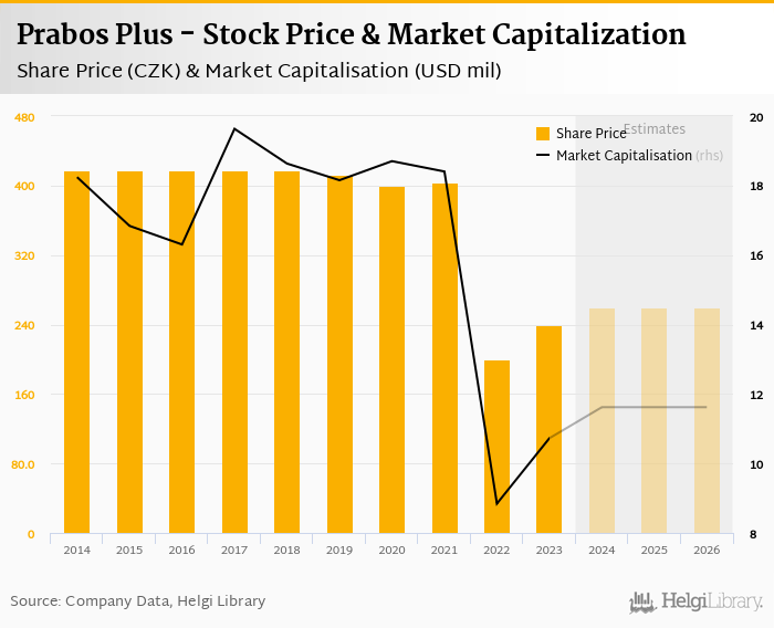 Prabos Plus stock traded at CZK 240 per share at the end 2023 implying a market capitalization of USD 10.7 mil.