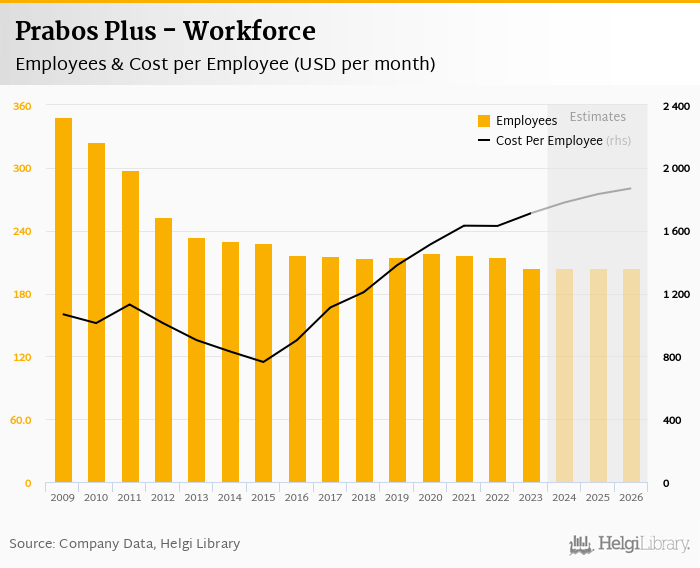 Prabos Plus employed 204 employees in 2023, down 5.12% compared to the previous year. Historically, between 2007 and 2023, the firm's workforce hit a high of 369 employees in 2007 and a low of 204 employees in 2023.