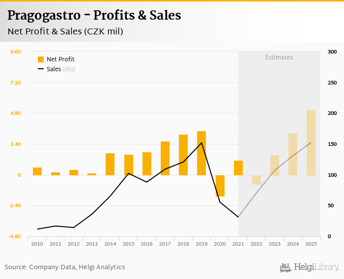 Pragogastro made a net profit of CZK 1.14 mil in 2021, up 168% compared to the previous year. Total sales reached CZK 31.3 mil, which is down 43.7% when compared to the previous year.