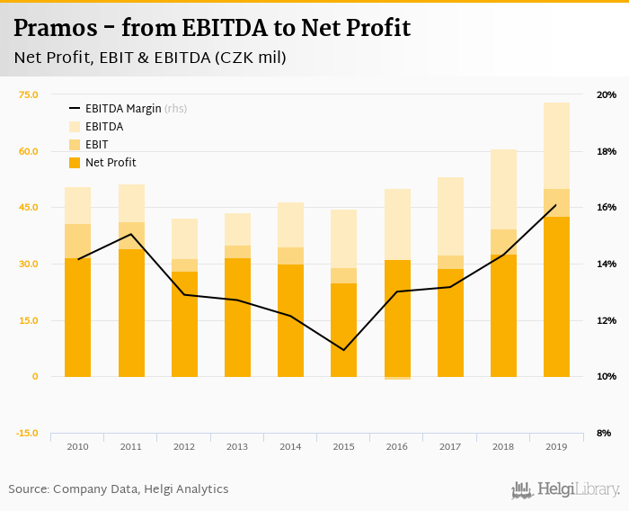 Pramos made a net profit of CZK 42.8 mil with revenues of CZK 454 mil in 2019, up by 31% and up by 6.93%, respectively, compared to the previous year. This translates into a net margin of 9.43%.