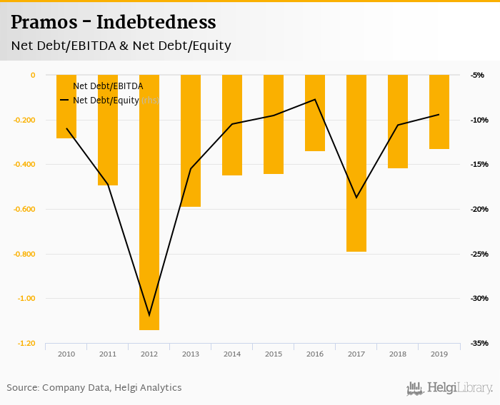 Pramos's net debt stood at CZK -24.1 mil and accounted for -9.43% of equity at the end of 2019. The ratio is up 1.18 pp compared to the previous year.
