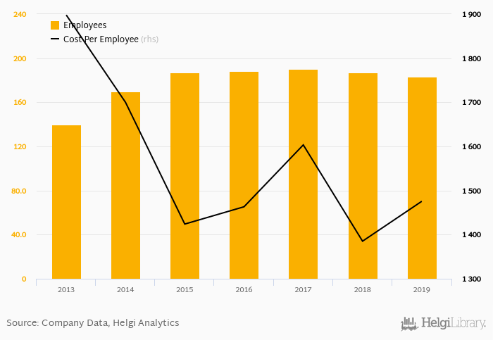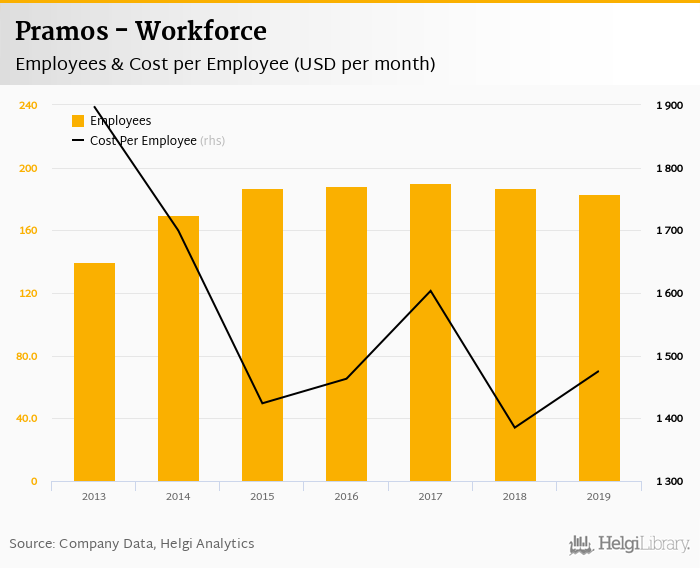 Pramos employed 183 employees in 2019, down 2.14% compared to the previous year. Historically, between 2013 and 2019, the firm's workforce hit a high of 190 employees in 2017 and a low of 140 employees in 2013.