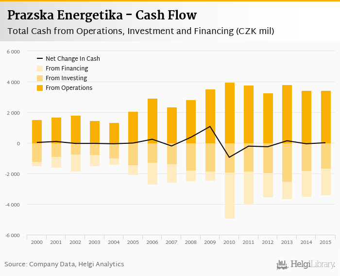 Prazska Energetika's operating cash flow stood at CZK 3,420 mil in 2015, down 0.643% when compared to the previous year. Historically, between 2000 - 2015, the firm’s operating cash flow reached a high of CZK 3,970 mil in 2010 and a low of CZK 1,332 mil in 2004.