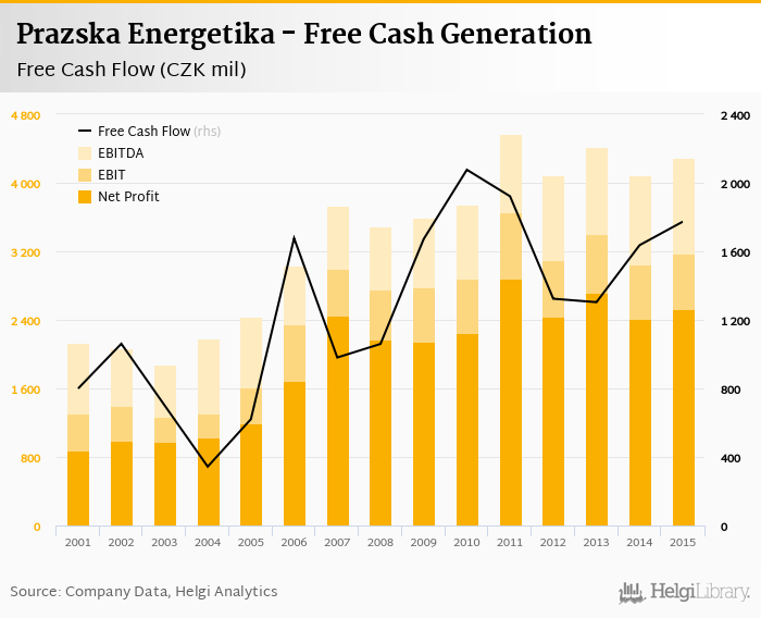 Prazska Energetika made a net profit of CZK 2,523 mil with revenues of CZK 18,772 mil in 2015, up by 4.36% and up by 0.335%, respectively, compared to the previous year. This translates into a net margin of 13.4%.