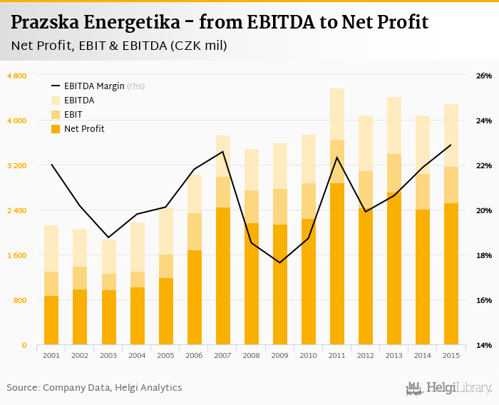 Prazska Energetika made a net profit of CZK 2,523 mil with revenues of CZK 18,772 mil in 2015, up by 4.36% and up by 0.335%, respectively, compared to the previous year. This translates into a net margin of 13.4%.