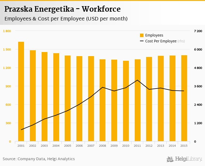 Prazska Energetika employed 1,403 employees in 2015, up 0.143% compared to the previous year. Historically, between 2000 and 2015, the firm's workforce hit a high of 1,640 employees in 2000 and a low of 1,314 employees in 2010.