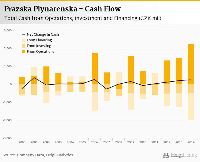 Cash from financing amounted to CZK -1,486 mil, so the company generated CZK 227 mil net cash in 2014.
